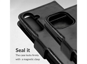 Indvendigt i book-casen finder du to lommer til betalingskort eller kontanter, hvoraf den ene har en praktisk slide-åbning. Derudover er der en stor lomme til dokumenter, så du kan holde alle dine essentielle genstande organiseret og let tilgængelige. Casen og coveret er designet, så alle åbninger til kamera, lyd og stik forbliver fuldt tilgængelige, hvilket sikrer, at din mobiltelefon er fuldt funktionel, selv når den er i casen.